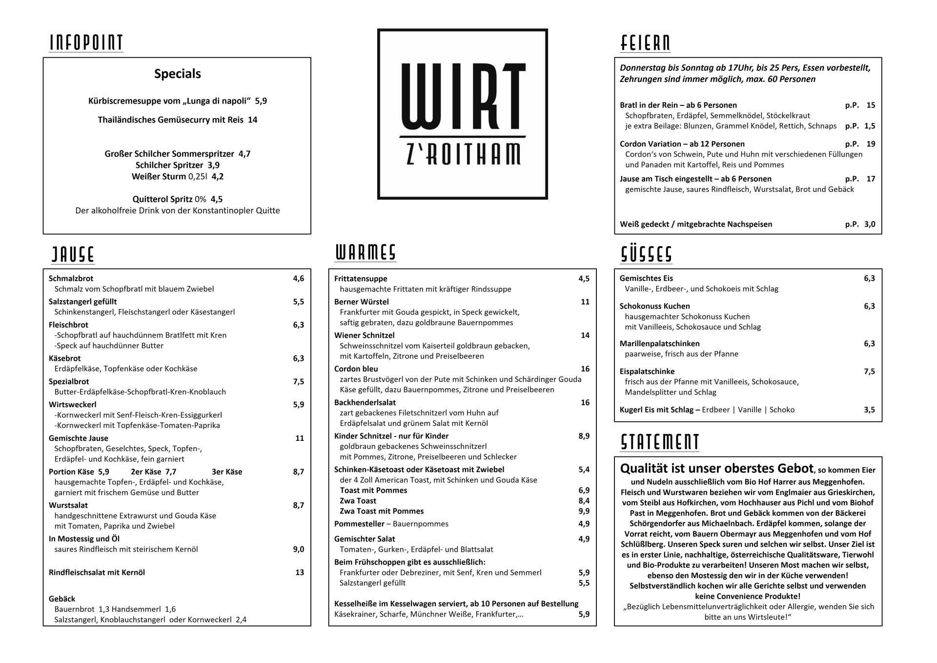 so kommen Eier und Nudeln ausschließlich vom Bio Hof Harrer aus Meggenhofen. Fleisch und Wurstwaren beziehen wir von der Metzgerei Englmaier aus Grieskirchen, vom Steibl aus Hofkirchen, vom Biohof Past in Meggenhofen und von der Landmetzgerei Hochhauser. Brot und Gebäck kommen von der Bäckerei Schörgendorfer aus Michaelnbach. Erdäpfel kommen, solange der Vorrat reicht, vom Bauern Obermayr aus Meggenhofen und vom Hof Schlüßlberg. Unseren Speck suren und selchen wir selbst. Unser Ziel ist es in erster Linie, nachhaltige, österreichische Qualitätsware und Bio-Produkte zu verarbeiten! Unseren Most machen wir selbst, ebenso den Mostessig den wir in der Küche verwenden! Selbstverständlich kochen wir alle Gerichte selbst und verwenden keine Convenience Produkte!